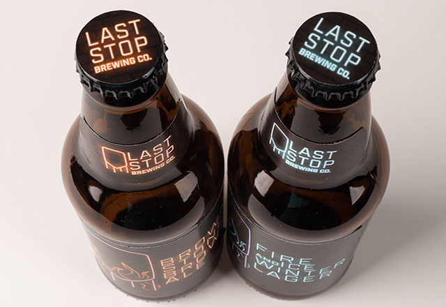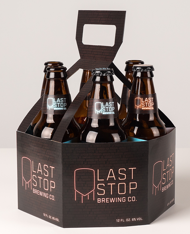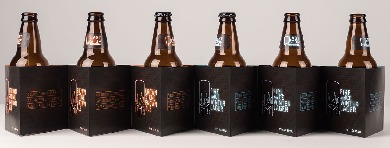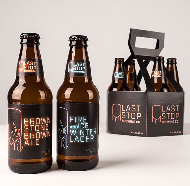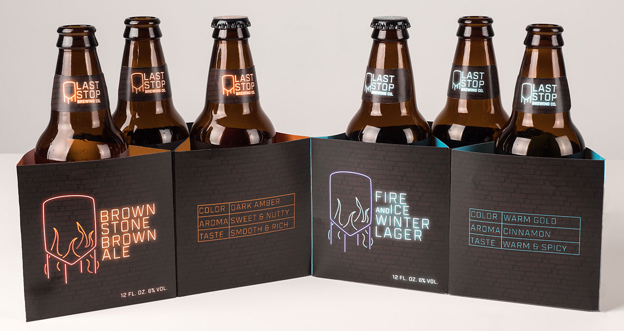 LAST STOP BREWING CO. The design aesthetic for Last Stop Brewing Company was established after researching the brewery’s location of Hell’s Kitchen, New York. The vibrant neon effect found on the labels and packaging is based on the iconic neon signs found in this area while the water tower shape is a nod to the tanks found on the roofs of the area buildings as well as the vats in which the beer is brewed. A medium weight blocky typographical treatment recalls the shapes of text found on neon signs while also having an industrial feel that represents the brand well. Two brew options were designed with a variation in the color palettes for easy shelf recognition. The beer is packaged in shorter bottles as a nod to the building regulations established in this New York neighborhood that do not allow for tall buildings. A sample pack was created that features both brews with descriptive information that can be found within the packaging when it is opened. Consideration for limited storage space was made when designing the package as each portion can be removed when there is no longer a bottle held within to save space. The namesake comes from the last stop on a subway line in this neighborhood.